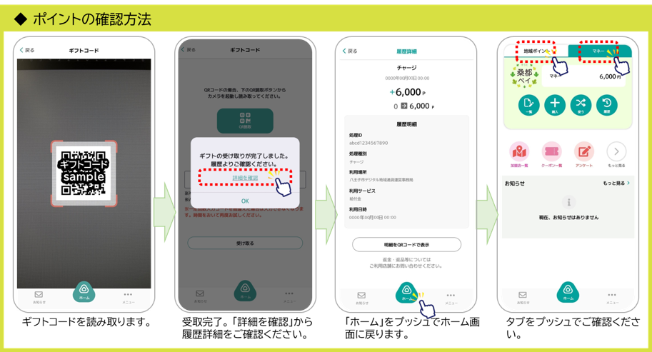 「桑都のまち応援給付金」のポイントは、『マネー』に加算されます。桑都ペイアプリのホーム画面のマネータブを押してご確認ください。