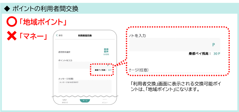 アンケートやイベント等で配布する「地域ポイント」のみ利用者交換をご利用いただけます。